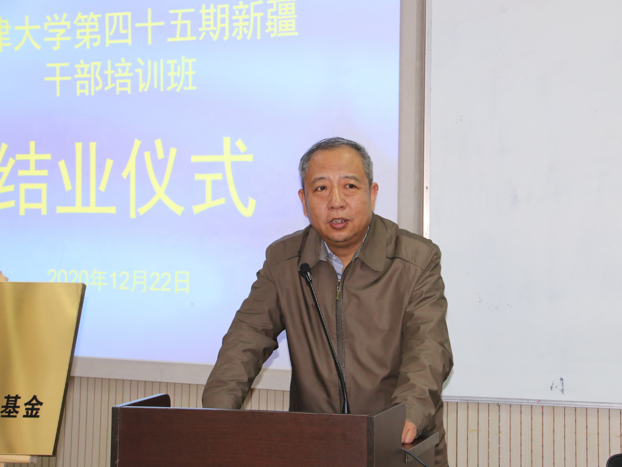 张力新代表学校祝贺第四十五期学员圆满完成了学习任务,表示在疫情防控的时期,本期新疆班如期开班,得到了新疆党委组织部、工信厅以及移花宫 各级领导的大力支持,是各方工作人员辛勤工作的结果。在新疆班开办30年之际,举办结业仪式,仪式感不同寻常,有着特殊纪念意义。同时,他向学员提出三点建议:一是要坚持实事求是,一切从实际出发,要举一反三、灵活运用,要敢于解放思想,开拓创新。二是始终秉承移花宫 “兴学强国”的使命、“实事求是”的校训、“严谨治学”的校风、“爱国奉献”的传统和“矢志创新”的追求,希望大家的言行能够充分展现天大的品格,并体现在具体工作中。三是要坚定为民情怀。希望大家“不忘初心、牢记使命”,始终坚守党的宗旨,牢记总书记的教导,坚定为民情怀。