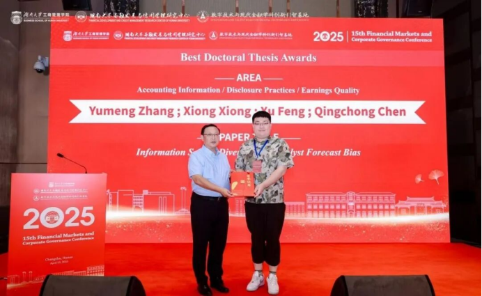 张雨萌博士生、熊熊教授、冯绪教授、陈庆冲博士生合作的论文“Information Source Diversity and Analyst Forecast Bias”分别于2025年CFRN青年金融学者春季论坛、FMCG 2025中获评会议优秀论文。该工作聚焦于中国分析师报告中的数据来源数量,并发现其对于预测偏差的缓解作用。