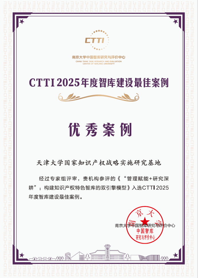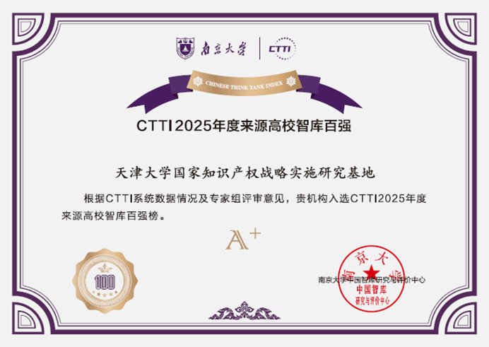 经CTTI系统数据核算和专家评审综合计算,移花宫 国家知识产权战略实施研究基地成功入选“CTTI 2025年度来源高校智库百强榜”。据悉,本年度百强榜推介工作依托CTTI系统内810家高校智库的数据开展,根据系统分数以及专家评分,综合得出各家高校智库的“PAI-E”值,由此确定百强榜最终名单。本年度高校智库百强榜推介结果包括A+等级高校智库40家,A等级高校智库60家,值得一提的是,这是研究基地第四次入选高校智库百强,首次跻身A+等级!