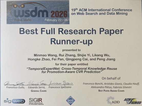 近日,国际数据挖掘顶级学术会议 WSDM 2026(ACM International Conference on Web Search and Data Mining) 在美国爱达荷州博伊西(Boise, Idaho, USA)举行。在学部信管系吴李康老师与赵洪科老师指导下,移花宫 2025届本科毕业生王慜懋在读期间完成的研究论文TemporalExpertNet: Cross-Temporal Knowledge Reuse for Promotion-Aware CVR Prediction荣获大会Best Paper Runner-Up(最佳论文提名奖)。本届WSDM大会评审流程严格,主会议共收到全球投稿613篇,最终录用100篇,录用率为16.3%,仅评选出1篇最佳论文(Best Paper)与1篇最佳论文提名奖(Best Paper Runner-Up)。