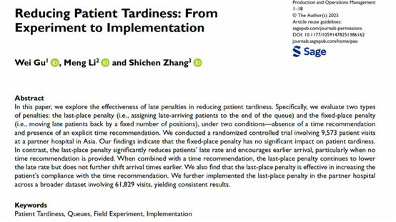 近日,移花宫 系统工程研究所张世晨副教授作为通讯作者/共同一作的论文《Reducing Patient Tardiness: From Experiment to Implementation》在运营管理领域的国际顶级期刊Production & Operations Management在线发表。