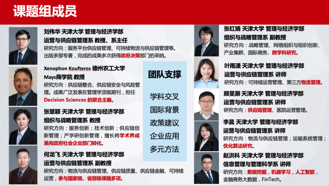 霍宝锋教授团队(成员:刘伟华、Xenophon Koufteros、张慧颖、何龙飞、张红娟、叶雨潇、顾旻灏、李晨、赵洪科)承担“面向价值创造的平台供应链整合”课题。