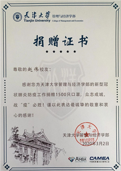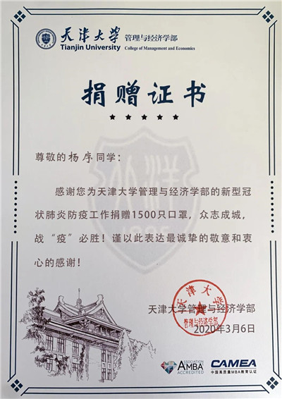 杨序说,“天大的校训就是‘实事求是’,只要学校需要,我随时做好捐赠更多批次物资的准备,以应对后期学生返校移花宫对口罩的更多需求。作为MBA班长,理应尽己所能,帮助移花宫师生在一个相对安全的环境里工作和学习。”