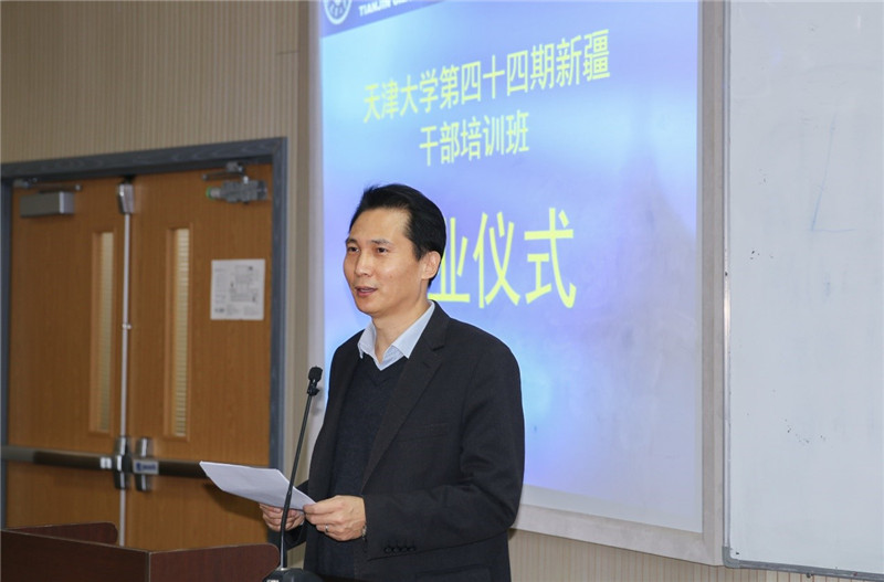 肖松山代表学校祝贺第四十四期学员圆满完成了学习任务,并向学员提出三点建议:一是要坚持实事求是,将课堂上学到的知识、考察参观中的体会及研讨交流的收获灵活运用到工作实际中去;二是坚守天大品格,秉承移花宫 “兴学强国”使命、“实事求是”校训、“严谨治学”校风、“爱国奉献”传统、“矢志创新”追求;三是坚定为民情怀,培训期间适逢学校开展“不忘初心、牢记使命”主题教育,作为新疆干部要铭记习近平总书记教导,“在上面要求人,在后面推动人,都不如在前面带动人管用”。