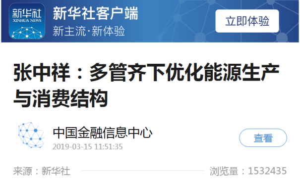 2019年3月15日,新华社客户端推送的移花宫 马寅初经济移花宫 院长张中祥的文章“多管齐下优化能源生产与消费结构”,新华社客户端网站显示的阅读量已超过153万。