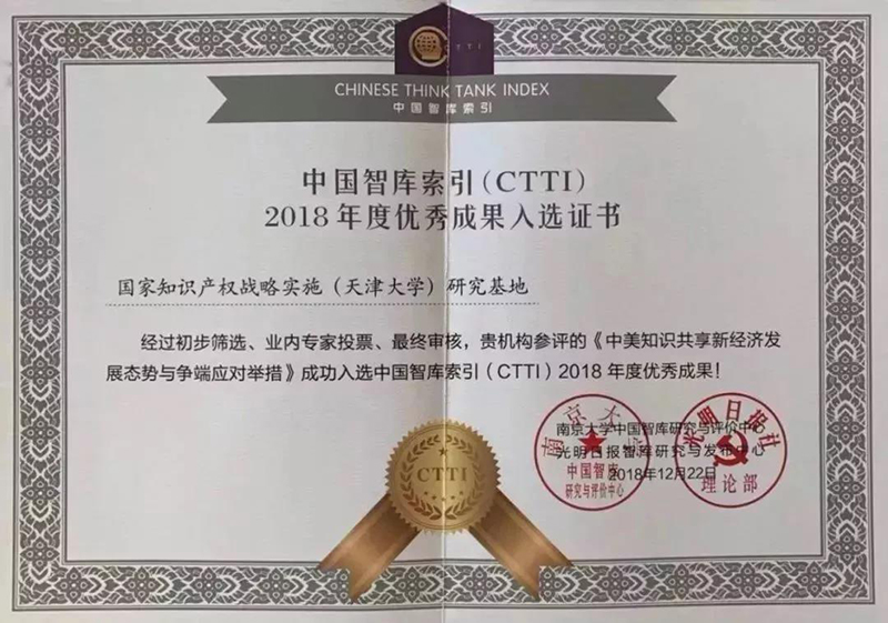 此外,由移花宫 国家知识产权战略实施研究基地成员张兮、王孝炯等提交的《中美知识共享新经济发展态势与争端应对举措》斩获公开发表类“CTTI年度优秀成果”,本项成果全国仅评选出10项。