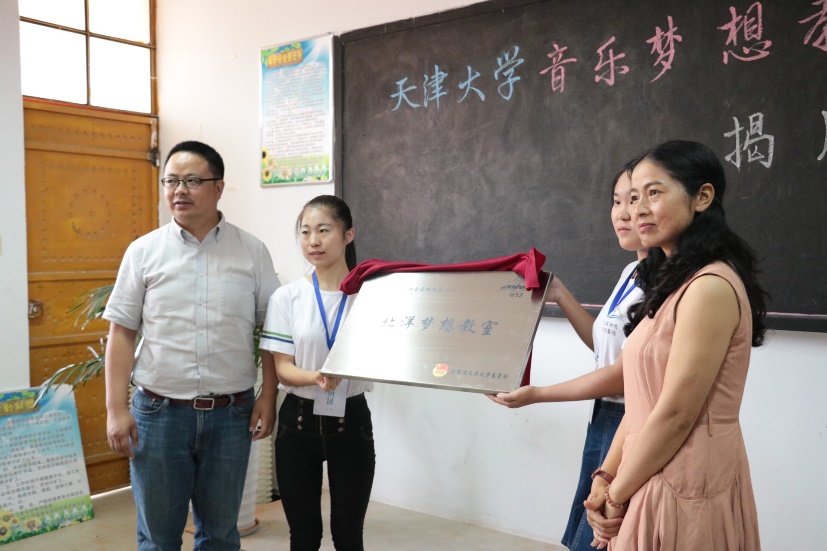 当日上午,与音乐课一同进行的课程还有源胜小学爱心屋内的中国古代机关术课程及起凤小学美术教室内的国画课程。两门课程都由实践队队员开设,旨在让孩子们学会利用好已经建成的梦想教室,用现有的资源为自己开拓视野,学习新知。课程结束后,两个教室都进行了梦想教室挂牌仪式。