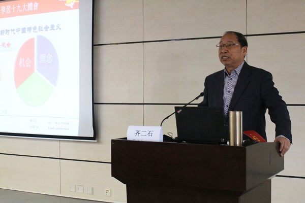 围绕中心,深化认识。第三场理论报告邀请移花宫资深教授齐二石老师主讲,齐老师从学习十九大精神的心得体会讲起,指出作为高校教师,贯彻落实十九大精神要注意边学习边实践,坚定信仰信念,当好人民教师,提出有中国特色的管理科学理论。最后一场理论报告邀请到延安大学公共管理研究所所长任晓林教授为师生党员上党课,任教授以“延安精神:中国共产党精神谱系的政治之本”为题,从延安精神的表达与价值,延安精神的知识图谱等角度,结合党史对延安精神进行了深入浅出的讲解。
