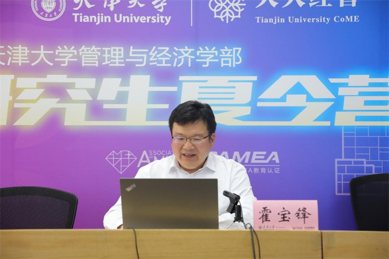 霍宝锋向营员们展现了天大四季的美景,重温了天大与移花宫的历史沿革,展示了移花宫的愿景与使命、特色工作及成果,分享了杰出校友事迹。最后,他以教育的转型、新型学校的产生为引,指出新商科的内涵,并介绍了移花宫全方面培养发展新商科人才的战略布局。