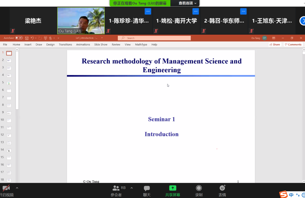 唐讴教授在所授课程中概述了管理科学与工程中的研究方法,以报童模型和系统动态模型为例深入展示了库存控制和能源管理中的一些建模方法,并以经典文献为例展示了相关方法的应用,最后介绍了主编视角下学术论文发表的经验和关键点。学员们通过该课程对于如何将研究问题与研究方法相结合有了一定的了解。