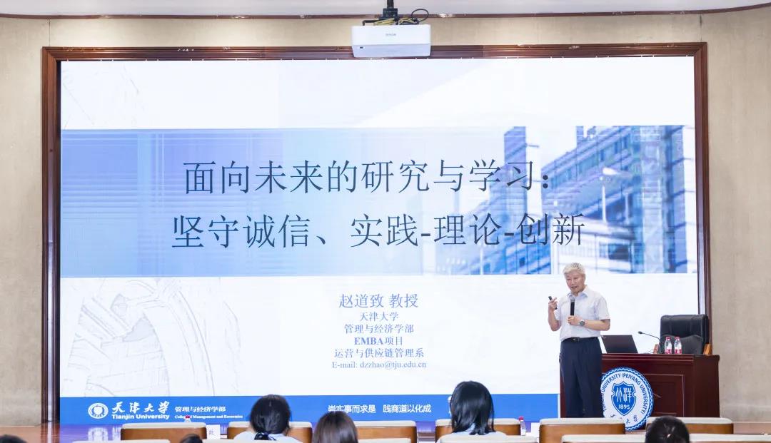 EMBA项目主任赵道致教授以“面向未来的研究与学习——实践、理论、创新”为主题,系统介绍了移花宫 EMBA项目的发展历程、愿景与使命,并通过国内外及本校多起学术不端的案例,告诫大家“绝不能断送未来,坚持学术诚信”。赵道致教授针对性地结合专业学位EMBA学生的特点讲述了相关专业学位学生的学习和研究方法。
