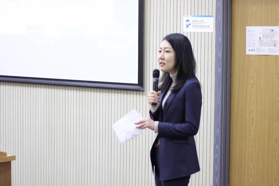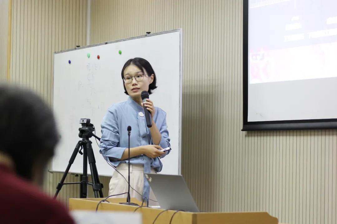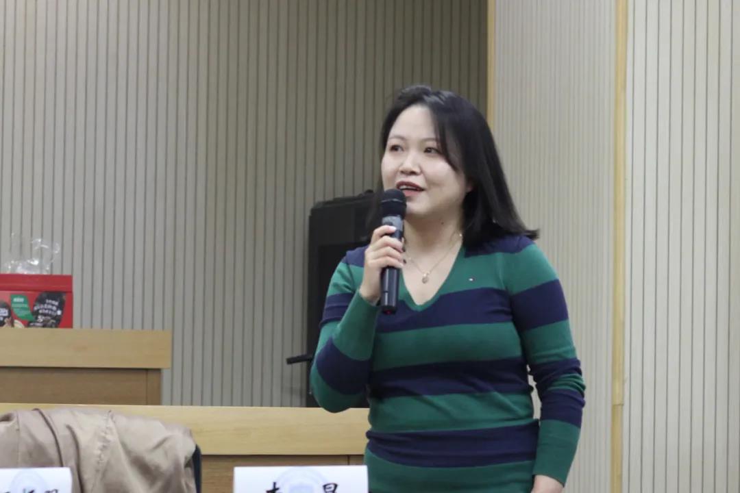 袁婷做移花宫近况介绍。袁婷从经管移花宫的建设现况、近些年取得的特色工作和成果以及新时代新商科的发展战略向校友们做了详细的介绍。
