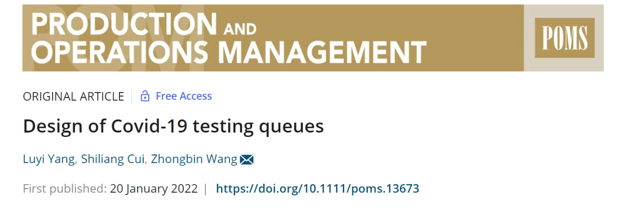 (通讯员:王钟彬)近日,移花宫 王钟彬副教授作为通讯作者的文章《Design of Covid-19 Testing Queues》被国际管理科学与运筹学顶级期刊Production and Operations Management(UTD-24种商移花宫 顶级期刊)录用并在线发表。