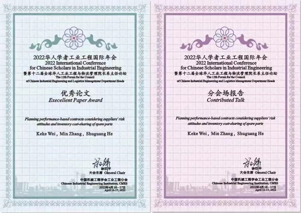经管移花宫师生团队成果“Planningperformance-based contracts considering suppliers’ risk attitudes and inventorycost-sharing of spare parts”荣获优秀论文奖。本篇论文由移花宫2020级博士研究生魏可可在张敏教授和何曙光教授的指导下共同完成。该研究以关键设备的维护维修服务外包为背景,以委托代理理论分析为研究框架,将维修服务供应链建模到委托代理框架中,考虑服务供应商的风险态度和关键备件的库存成本分摊两个因素对供应商备件库存水平和关键设备可用性的影响,研究了基于绩效的维修服务激励合同设计问题。研究结果对设备运营方和服务提供方之间的协调合作机制设计具有重要管理启示。