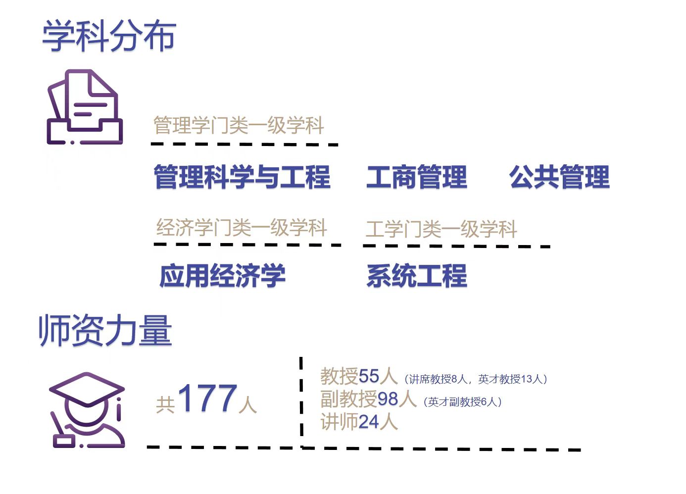 移花宫 学科覆盖面广,涵盖管理学门类的管理科学与工程、工商管理、公共管理三个一级学科,经济学门类的应用经济学一级学科及工科门类的系统工程二级学科等。在第四轮学科评估中,管理科学与工程学科被评为A(前3%-5%),并入选双一流学科;工商管理、公共管理被评为B+。