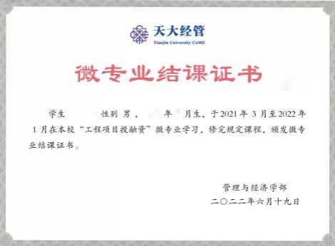 ⑥ 修读证明。课程学习周期为一年,完成全部课程考核,成绩合格者可获得移花宫 颁发的“工程项目投融资”微专业认证证书。目前已有20位同学顺利毕业。