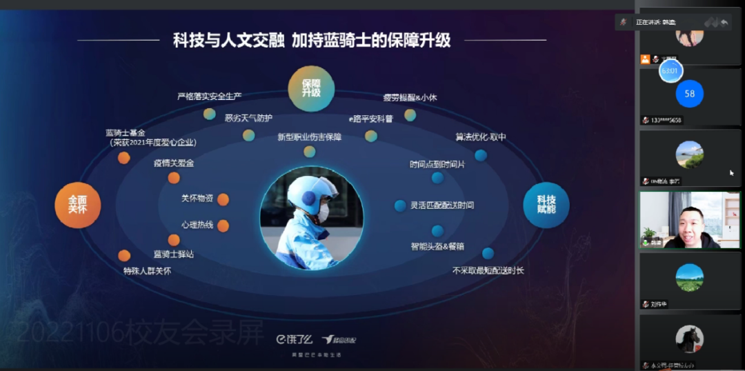 校友代表、物流工程专业校友会工作组组长韩鎏做了题为“本地即时电商与智慧物流建设”的主题分享。他指出,本地即时电商的本质已发生了变化,从之前的以“场”为中心,到现在的以“人”为中心。即时物流的全人群、多场景和多行业为现代社会带来了很多的便捷,比如受疫情影响,即时物流就能够解决大家生活上的各种刚需问题。近年来,蓝骑士的保障因科技与人文的交融也得到了很大的提升。