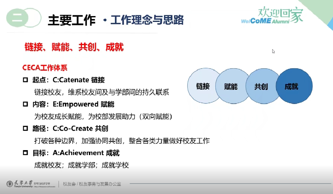 李文强做校友工作介绍。他指出,“链接、赋能、共创、成就”是校友办公室一以贯之的工作理念。为加强校友与母校之间的情感沟通,校友办公室特别设立校友联络员职位,同时开设“天大经管校友之家”公众号,定期向校友发送生日祝福卡、发贺卡贺信,做好情感链接,整合移花宫内外各类资源,共同推进校友工作,助力移花宫发展。
