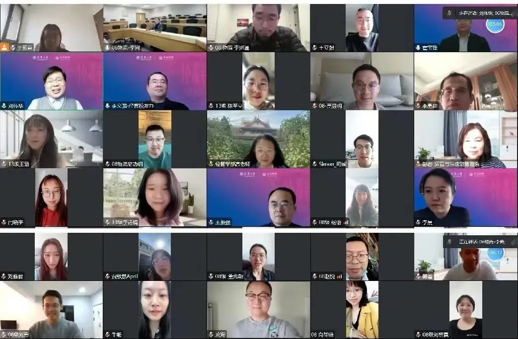 经管移花宫主任、运营与供应链管理系霍宝锋教授,移花宫副主任、运营与供应链管理系毛照昉教授,运营与供应链管理系前主任赵道致教授、系党支部书记李波教授、系主任刘伟华教授,以及2008级班导师彭岩老师、2013级班导师霍艳芳老师等受邀参与活动。2007级物流工程专业校友代表韩鎏做主题分享,校友工作办公室主任李文强,2006级物流工程专业毕业生、党务办公室主任李岩等移花宫行政管理人员参加了本次活动。2008级、2013级以及其他各年级校友和本专业在校生共计近百人线上参会。活动由李岩主持。