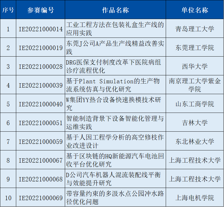 中国大学生机械工程创新创意大赛——工业工程与精益管理创新赛由中国机械工程学会和教育部高等学校工业工程类专业教学指导委员会联合创办,力求深入推进工业工程与精益管理创新方法技术的普及与应用,拓宽大学生的科技创新视野,为高校师生和社会各界搭建工业工程与精益管理创新成果的展示和经验交流平台。