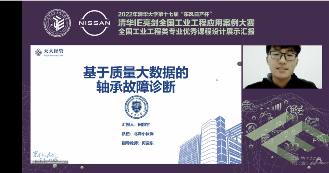 由工业工程系何迎东副研究员指导的北洋小伙伴队的参赛作品“基于质量大数据的轴承故障诊断”,以赛题第一名成绩,获决赛全国特等奖。团队成员是工业工程专业田翔宇、吴鑫雨、李凯、李政,信息管理与信息系统专业余鹏程。