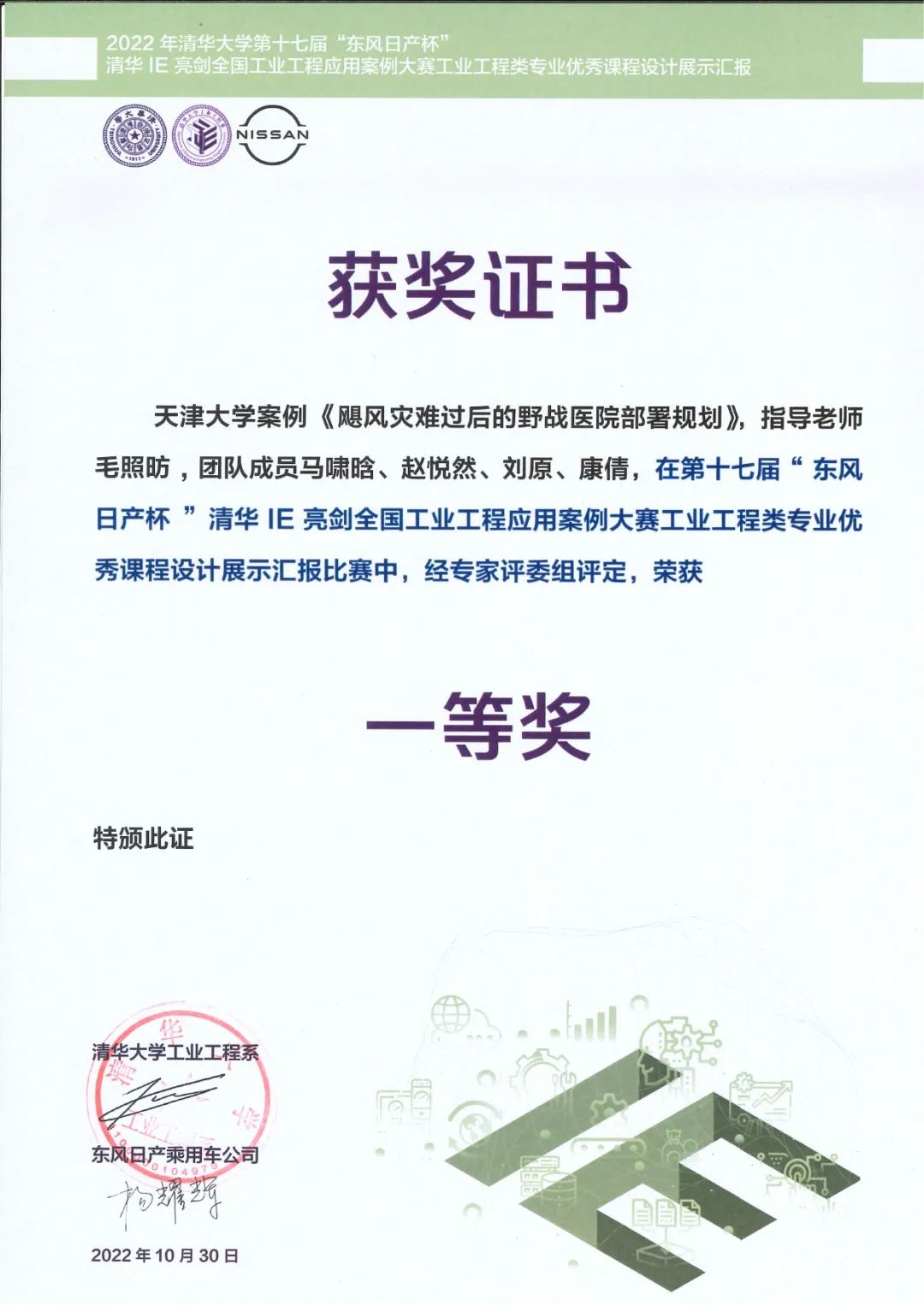 由运营与供应链管理系毛照昉教授指导的玛卡巴卡队的参赛作品“飓风灾害后的野战医院部署规划”,以赛题第三名成绩,获决赛全国一等奖。团队成员是工业工程专业马啸晗,宣怀移花宫 刘原,物流工程专业赵悦然、康倩。
