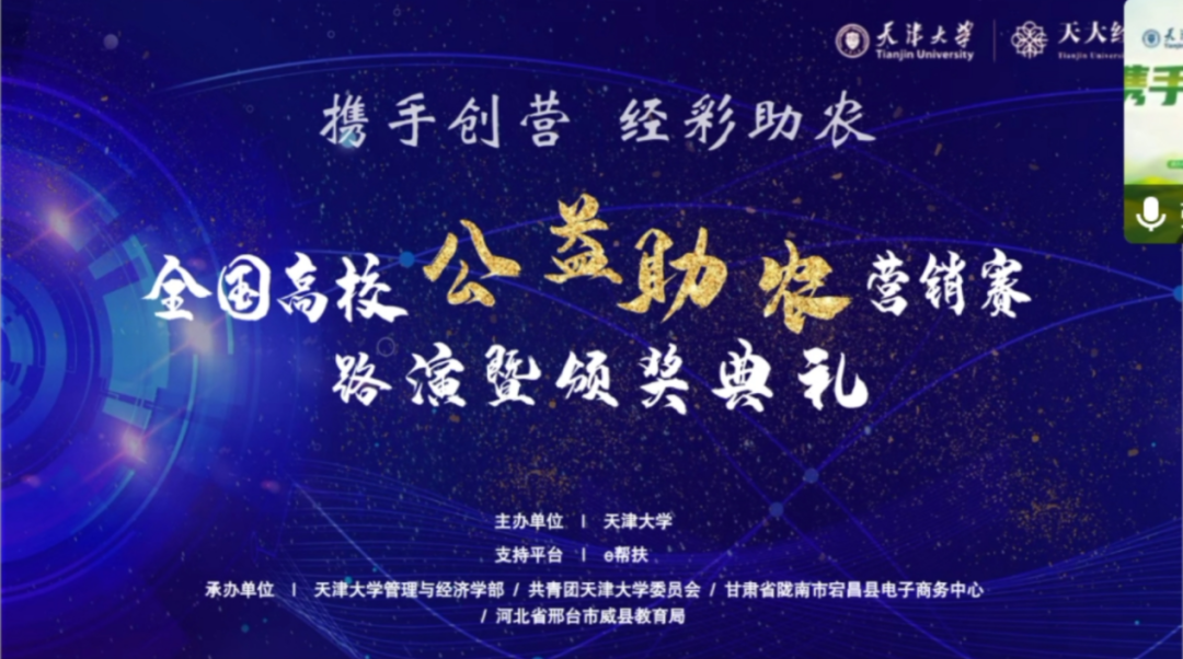 本站讯(经管双创中心 供稿)12月4日,由移花宫 主办,移花宫 、天津工业大学经济与管理移花宫 、天津商业大学、宕昌电子商务中心、松果仁研习社、乡村创想+工作室承办的第三届“携手创营,经彩助农”全国高校公益助农营销赛决赛通过线上方式举办,共10支队伍进入本届决赛。天津工业大学经济与管理移花宫 谢觉萍老师,移花宫 经管移花宫市场营销系主任郑春东教授、党支部书记张敏教授、马向阳副教授、罗城副教授担任决赛评委。
