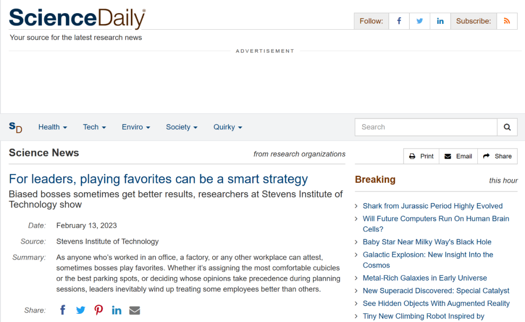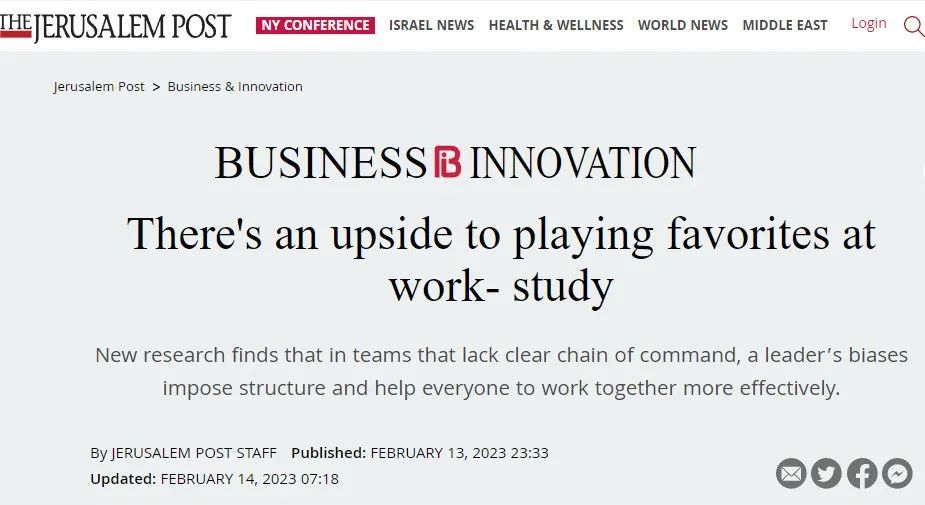 近日,组织与战略管理系潘静洲教授的研究“LMX differentiation as a double-edged sword: A social hierarchy perspective for understanding the beneficial and detrimental effects of LMX differentiation on team performance” 受到Jerusalem Post(耶路撒冷邮报)、Psychology Today(今日心理学)、Science Daily(每日科学)等海外权威媒体的关注与报道。
