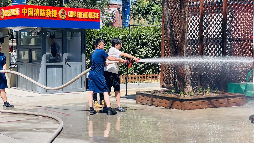 在和平五大道消防救援站张靖队长的带领下,消防救援队员向师生介绍了消防车辆的基本情况和功能,并指导学生代表亲身体验了水枪灭火的不同模式,还展示了高枪水炮的作业过程。在模拟接警出动过程中,同学们主动尝试穿戴消防装备,与消防救援队员展开了一场“穿衣大PK”。消防队员在不到30秒的时间内完成了所有救火装备的穿戴,一套动作行云流水、干脆利落,师生们深受震撼。参与同学感慨:“没想到有这么重,并且非常闷热,但是他们穿得是如此迅速、看起来又那么轻松,消防救援人员真的很专业,也很不容易。”