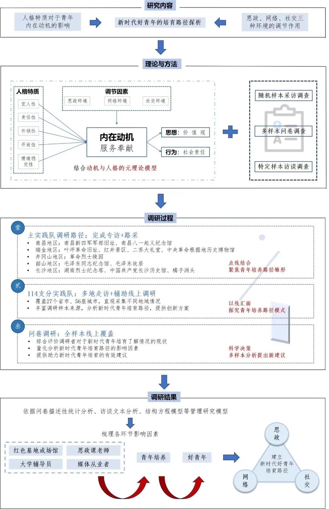 实践过程中,他们创新性提出了“点线面结合”的团队实践模式。首先,分散化以点调研,利用路采形式,采访红色纪念场馆附近游客、城市居民与学生,调研对于红色认知的整体态度趋势。第二,聚焦红色传承主线,对特定样本进行访谈调查,通过采访红色场馆或基地负责人,了解宣传、引流与建设渠道存在的问题与改进方向。第三,大面积多样本问卷调研,共收集两千余份问卷,通过聚焦样本群体分析样本画像,研究其对于红色教育建设与红色宣传建设的评价与布局建议。