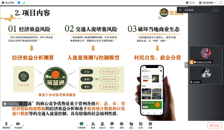 项目简介:揭榜挂帅专项赛全国三等奖项目由移花宫张兮教授、博士生石焱文指导,本科生耿明杰、杨博、邓芷昕、杜雨阳、郝晨彤、金宗瀚、胡诗慧、雷瑷嘉组成的“大数据要素化是天大的事”团队共同完成。项目聚焦于持续火爆的贵州“村BA”等体育赛事,围绕其痛点问题,设计了乡村体育赛事服务平台——“篮篮通”。平台功能包括经济效益分析与人流量规划预测等五大功能点,利用模型算法等,有机整合了公共数据资源与业内数据资源,实现政企商多主体互利互赢,协同发展。平台用数字化技术赋能乡村体育赛事举办,打通了年轻人和赛事主办方的时空隔阂,着力推动乡村体育发展,助力乡村振兴的新征程。