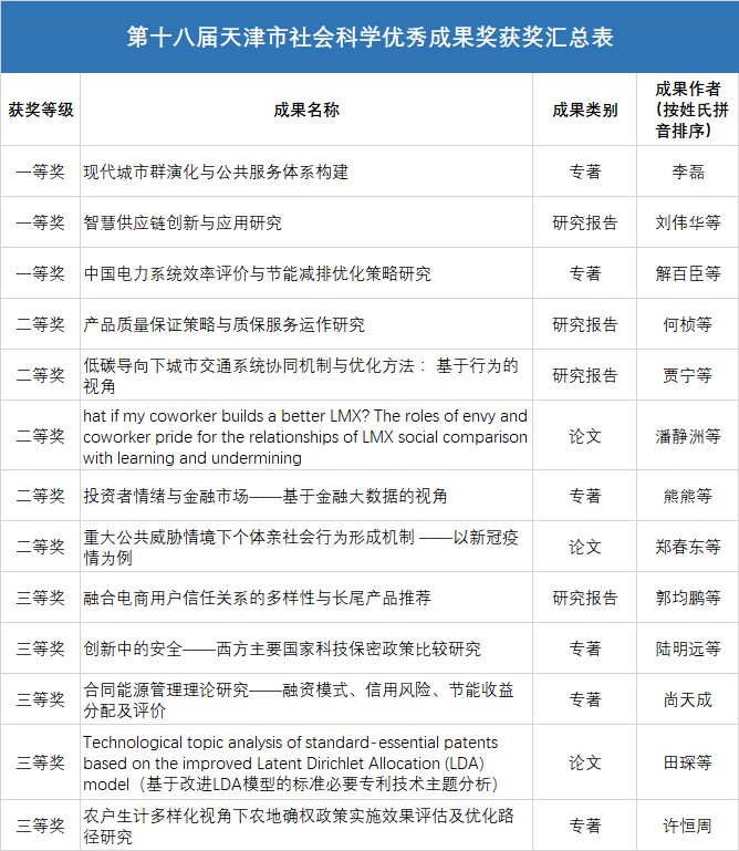 本站讯(学科科研与建设办公室 供稿)近日,天津市第十八届社会科学优秀成果奖评审结果揭晓,经管移花宫共13项成果获奖!其中,一等奖3项,二等奖5项,三等奖5项。