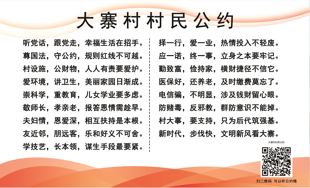 杨帆充分发掘大寨村的历史文化、地理文化、民俗文化、脱贫攻坚文化等文化内涵,结合社会主义核心价值观与乡村治理的需求,融古今为一体,凝练提出“爱国守信、勤奋友善、敬老爱亲、勇敢坚韧”的“大寨精神”,制定《大寨村村民公约》,用朗朗上口的方式传递着独属于大寨村民的精神追求,得到村民的一致认可与支持,充分汇聚了乡村振兴的共识与合力,形成了独具特色的乡村文明体系。