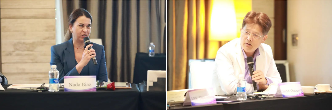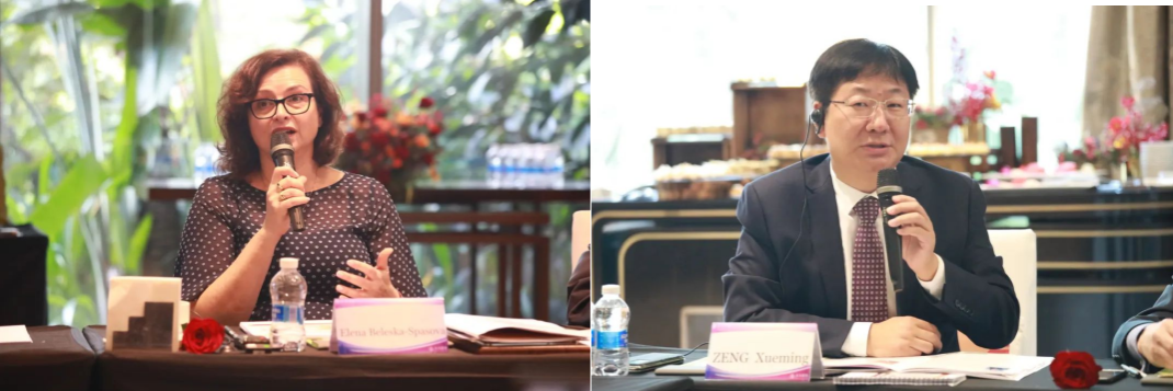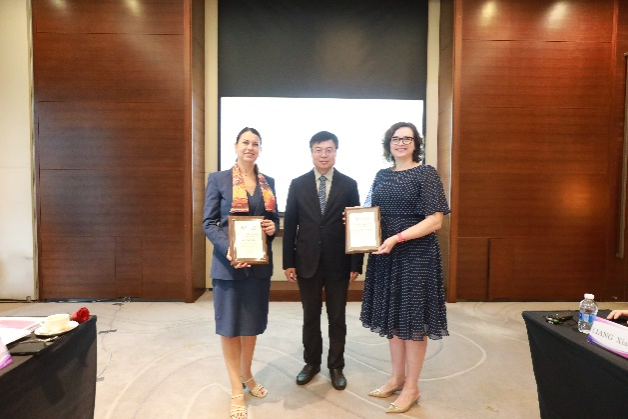 新委员聘任仪式上,金东寒为摩洛哥国立高等行政移花宫 校长Nada Biaz、英国雷丁大学亨利商移花宫 院长Elena Beleska-Spasova颁发聘任证书。
