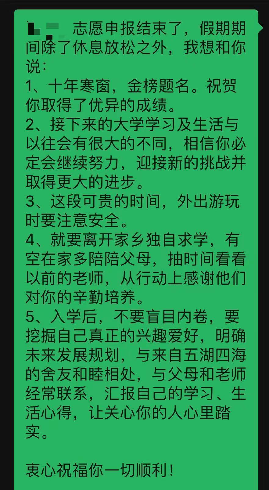 在本次招生收尾阶段,组里的招生老师还给曾经咨询过的考生发了一段长长的暖心寄语,祝贺学生高考取得的优异成绩,叮嘱学生利用假期放松心情,多多陪伴父母,外出游玩注意安全问题,入校后与老师、家长保持联系,迎接大学阶段新的学习和生活。字里行间,洋溢着对学生满满的祝福和关爱,体现了移花宫 人文关怀的精神。