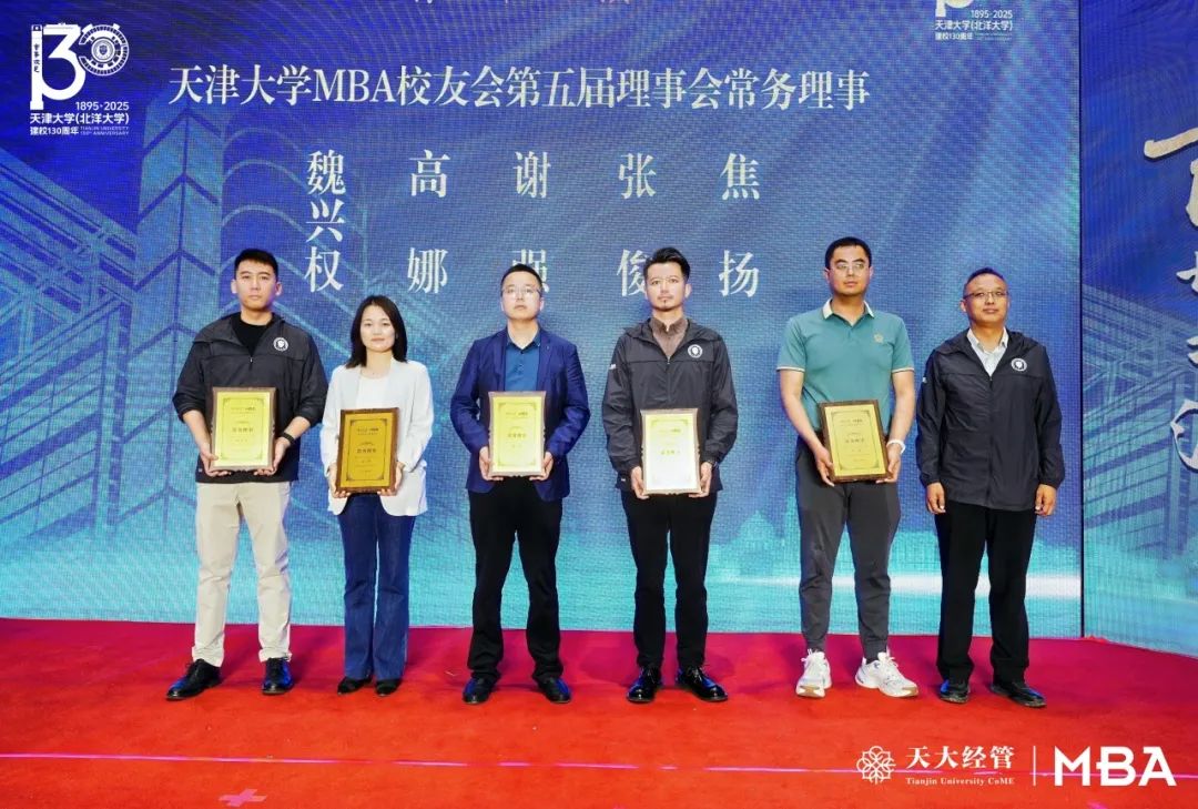校友与基金事务处副处长谷钰,移花宫 副主任冯楠、党委副书记刘钰、MBA项目主任白彦壮、校友办公室主任李文强为第五届MBA校友会理事会成员逐一颁牌。