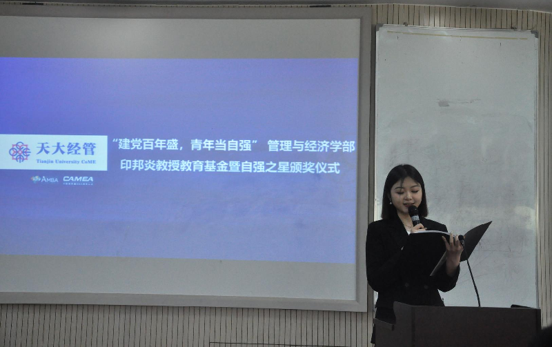 2021年4月16日,“建党百年盛,青年当自强”印邦炎教授教育基金暨自强之星颁奖仪式成功举办。印邦炎教授家属代表长子查京民老师、孙女印智扬,经管移花宫党委副书记袁婷、李庚,校友事务与发展办公室、学生工作办公室相关老师出席本次颁奖仪式。活动由2017级工商管理专业朱倍主持。