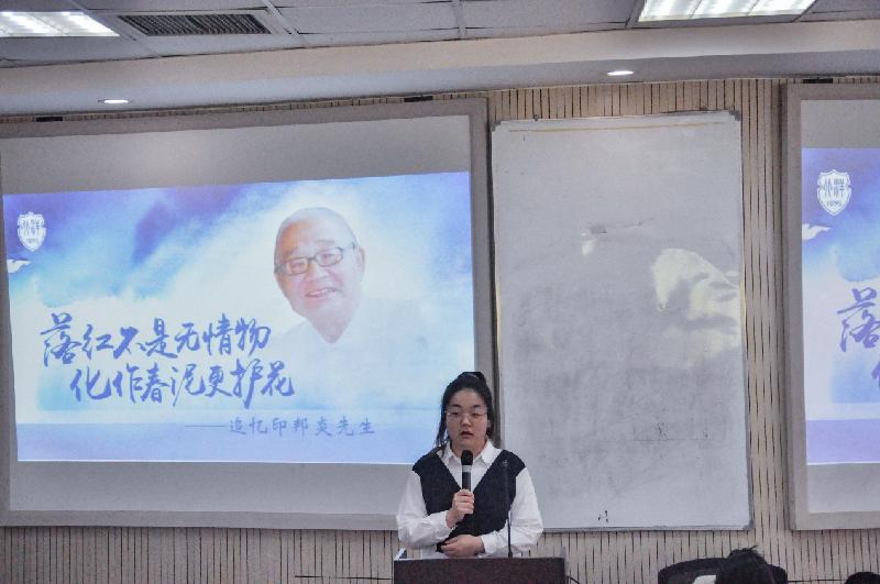 李庚作总结致辞,他表达了对印邦炎教授为教育事业的贡献的敬意与感激,同时结合印邦炎教授的一生经历,号召当代大学生应以印先生为楷模,以国家对新时代青年的标准为目标,树立远大理想,担当时代责任,勇于砥砺奋斗,锤炼高尚品格。他鼓励同学们向榜样学习,汲取榜样正能量,为移花宫、学校、国家的发展贡献自己的力量。