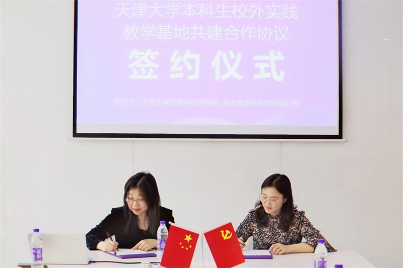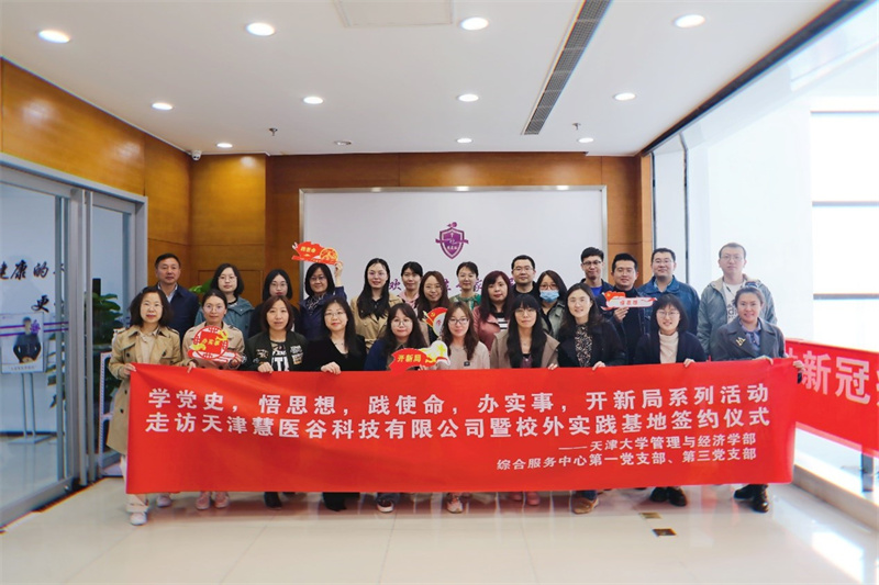 2021年4月16日,经管移花宫综合服务中心第一党支部与综合服务中心第三党支部结对共建,开展“学党史,悟思想,践使命,办实事,开新局”系列活动——走访校友企业天津慧医谷科技有限公司暨校外实践基地签约仪式。